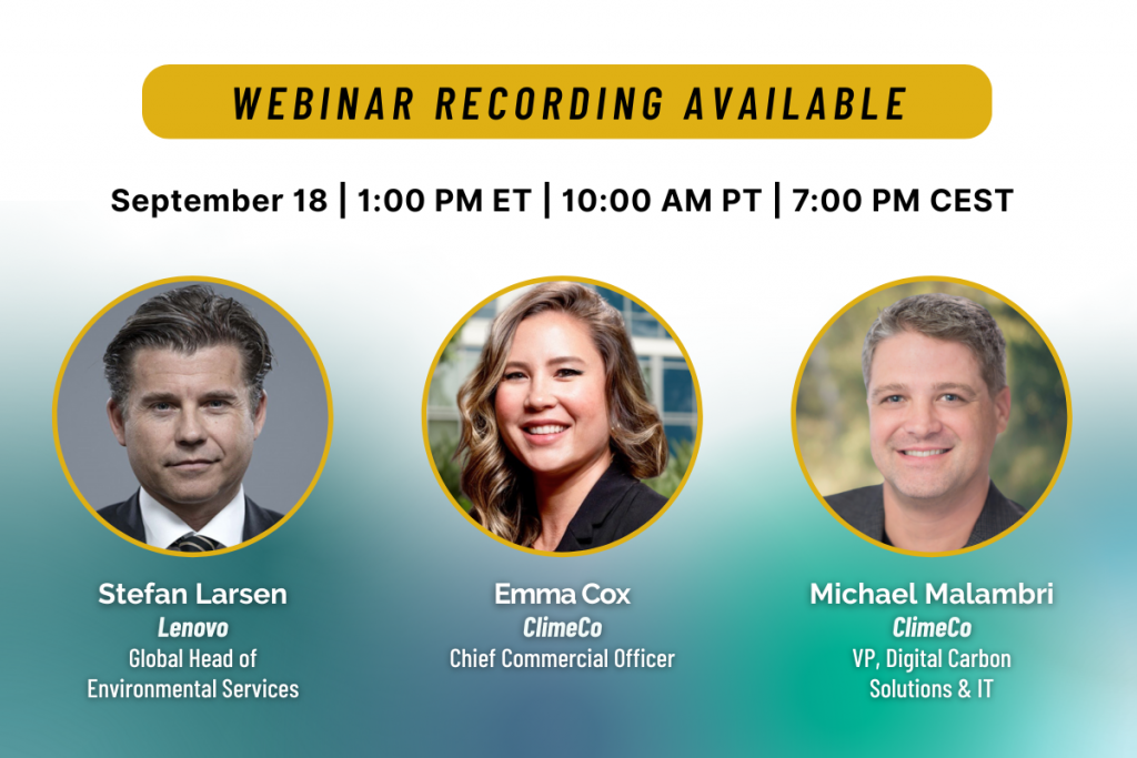 In this webinar hosted by ClimeCo, industry leaders will explore how companies can unlock overlooked opportunities by integrating carbon responsibility into transactions at scale. You’ll hear real-world insights from technology giant Lenovo, which has already adopted this approach with measurable success, as well as practical perspectives from experts on the intersection of climate action, business performance, and digital innovation. This session will highlight why embedding carbon solutions isn’t just about sustainability goals – it’s about competitive advantage, customer trust, and bottom-line impact.